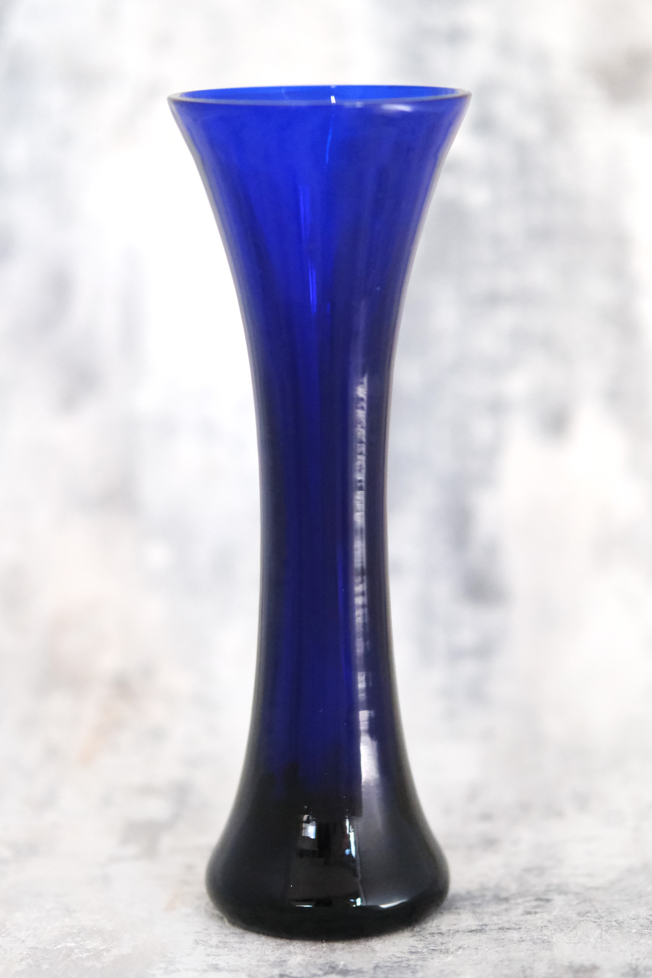 Believed to be a hand blown Bristol Blue bud vase this is a thing of beaty! A great placement for this item would be in the window so its colour can truely shine.